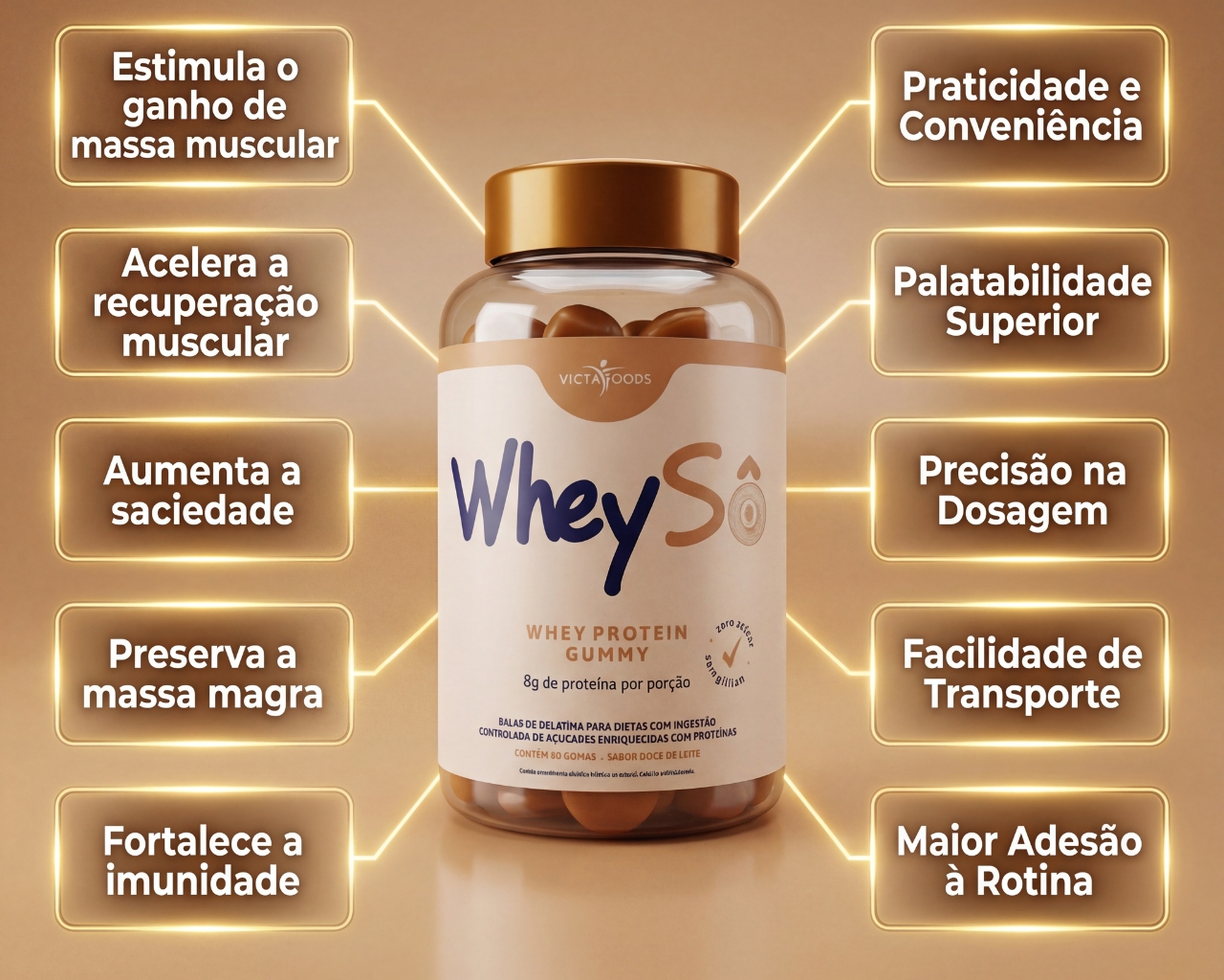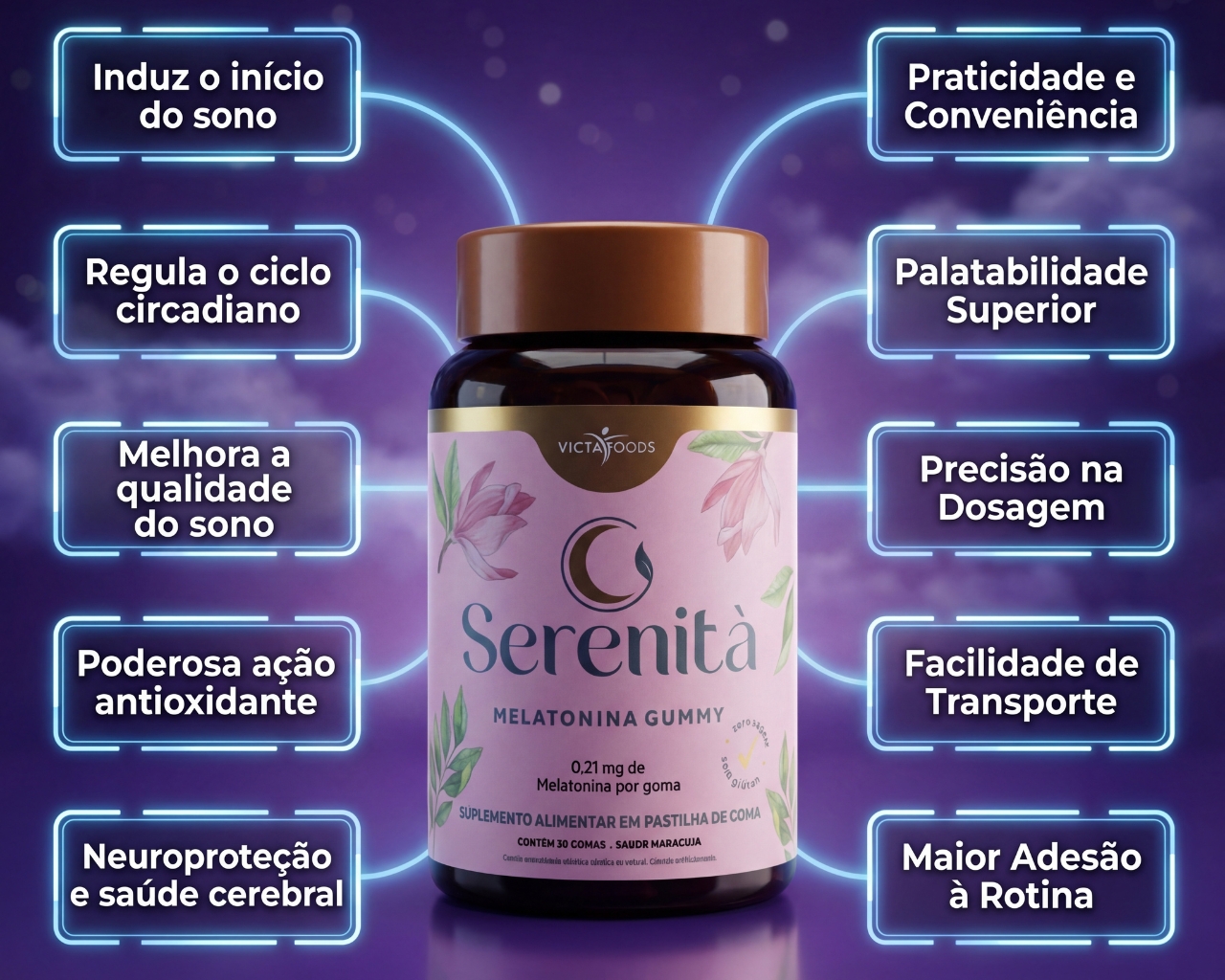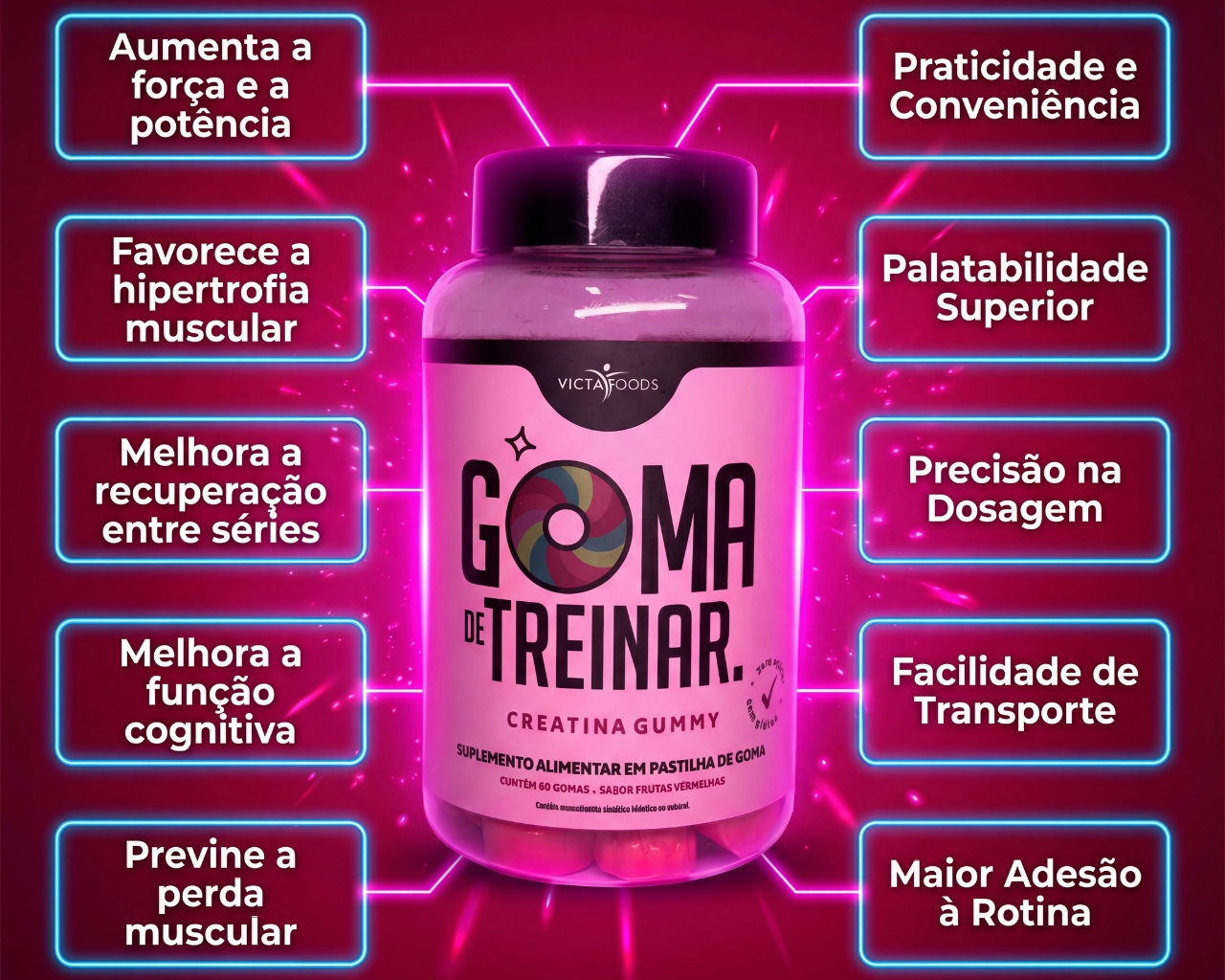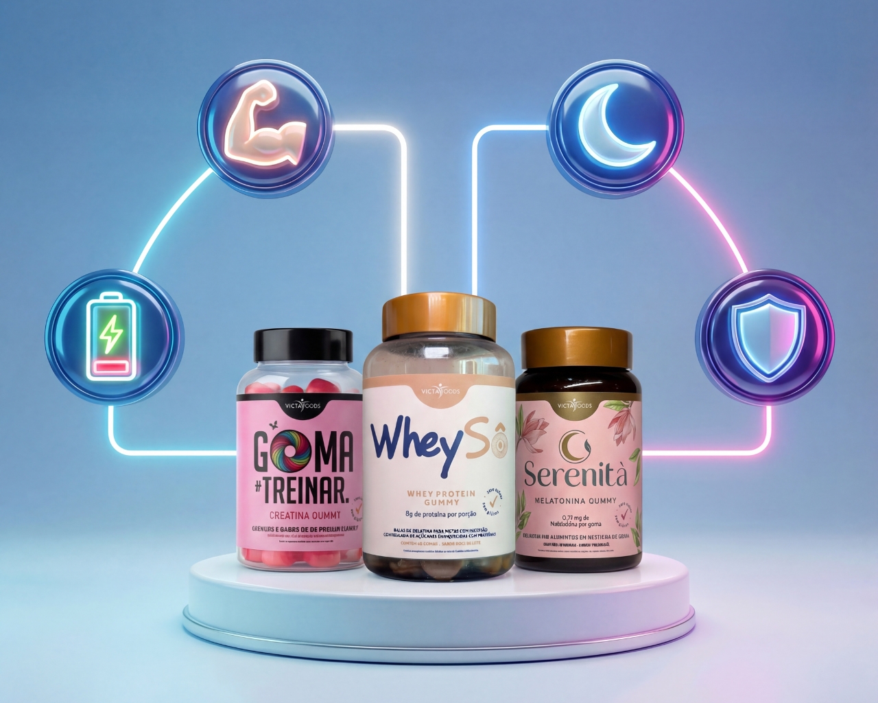 TRANSFORME SEU CORPO E SUA ROTINA SEM A SUJEIRA DOS PÓS E SEM COMPRIMIDOS RUINS. Você quer ter um corpo definido, energia para treinar e um sono reparador, mas odeia a rotina de preparar shakes, sujar coqueteleiras ou engolir cápsulas gigantes? Apresentamos o Kit Rotina Completa Victa Foods: A primeira suplementação de alta performance em formato de Gomas Gelatinosas (Gummies). Deliciosas, práticas e com a dosagem precisa que você precisa para resultados reais. O QUE VEM NO SEU KIT (3 POTES) 1. ENERGIA E FORÇA: Goma de Treinar (Creatina) O que é: Creatina Monohidratada pura em formato de goma. Sabor: Frutas Vermelhas (Delicioso!). Benefícios: Aumenta a força bruta, explosão muscular e melhora a função cognitiva. Dose: 3g de Creatina por porção. Quando usar: Pré ou Pós-treino (ou qualquer hora do dia). 2. CONSTRUÇÃO MUSCULAR: Whey Sô (Proteína + Colágeno) O que é: Blend de Proteína e Colágeno para nutrir seus músculos e pele. Sabor: Doce de Leite (Mata a vontade de doce sem sair da dieta). Benefícios: Estimula o ganho de massa magra, saciedade e recuperação muscular acelerada. Dose: 8g de Proteína por porção. Quando usar: Lanche da tarde ou pós-treino. 3. RECUPERAÇÃO NOTURNA: Serenità (Melatonina) O que é: Suplemento para indução e qualidade do sono. Sabor: Maracujá (Calmante e refrescante). Benefícios: Regula o ciclo do sono, ação antioxidante e neuroproteção. Acorde descansado e pronto para o próximo treino. Dose: 0,21mg de Melatonina por goma (Dosagem segura e eficaz). Quando usar: 30 minutos antes de dormir. POR QUE ESCOLHER SUPLEMENTOS EM GOMA? Zero Açúcar e Zero Glúten: Pode ser consumido por quem está de dieta ou tem restrições. Absorção Rápida: A mastigação inicia o processo digestivo antes mesmo de engolir, facilitando a absorção. Praticidade Total: Leve na bolsa, no carro ou deixe na gaveta do escritório. Não precisa de água, não precisa de shaker. Palatabilidade Superior: Esqueça o gosto de remédio ou de areia. É como comer uma bala, mas com benefícios nutricionais. FICHA TÉCNICA E SUGESTÃO DE USO Marca: Victa Foods Formato: Pastilhas de Goma (Gummy) Conteúdo do Kit: 1 Pote Goma de Treinar + 1 Pote Whey Sô + 1 Pote Serenità. Origem: Indústria Brasileira (Qualidade Garantida). MODO DE CONSUMO SUGERIDO: Manhã/Pré-Treino: Consuma a dose indicada da Goma de Treinar. Tarde: Use o Whey Sô como um lanche proteico para quebrar a fome. Noite: 1 goma de Serenità ao se preparar para dormir. PERGUNTAS FREQUENTES (FAQ) P: Engorda ou tem açúcar? R: Não! Todas as nossas gomas são Zero Açúcar. Elas são adoçadas com edulcorantes naturais que não elevam a insulina, perfeitas para dietas de definição. P: Posso levar na bolsa? Derrete? R: A embalagem é segura e as gomas são estáveis. Evite apenas deixar sob sol muito forte (como dentro do carro fechado no verão), mas em temperatura ambiente elas mantêm a textura perfeita. P: Qual a validade? R: Enviamos sempre lotes novos com validade longa para você consumir tranquilamente. GARANTA AGORA SUA ROTINA COMPLETA! Aproveite o preço promocional do Kit e experimente a revolução da nutrição saborosa.